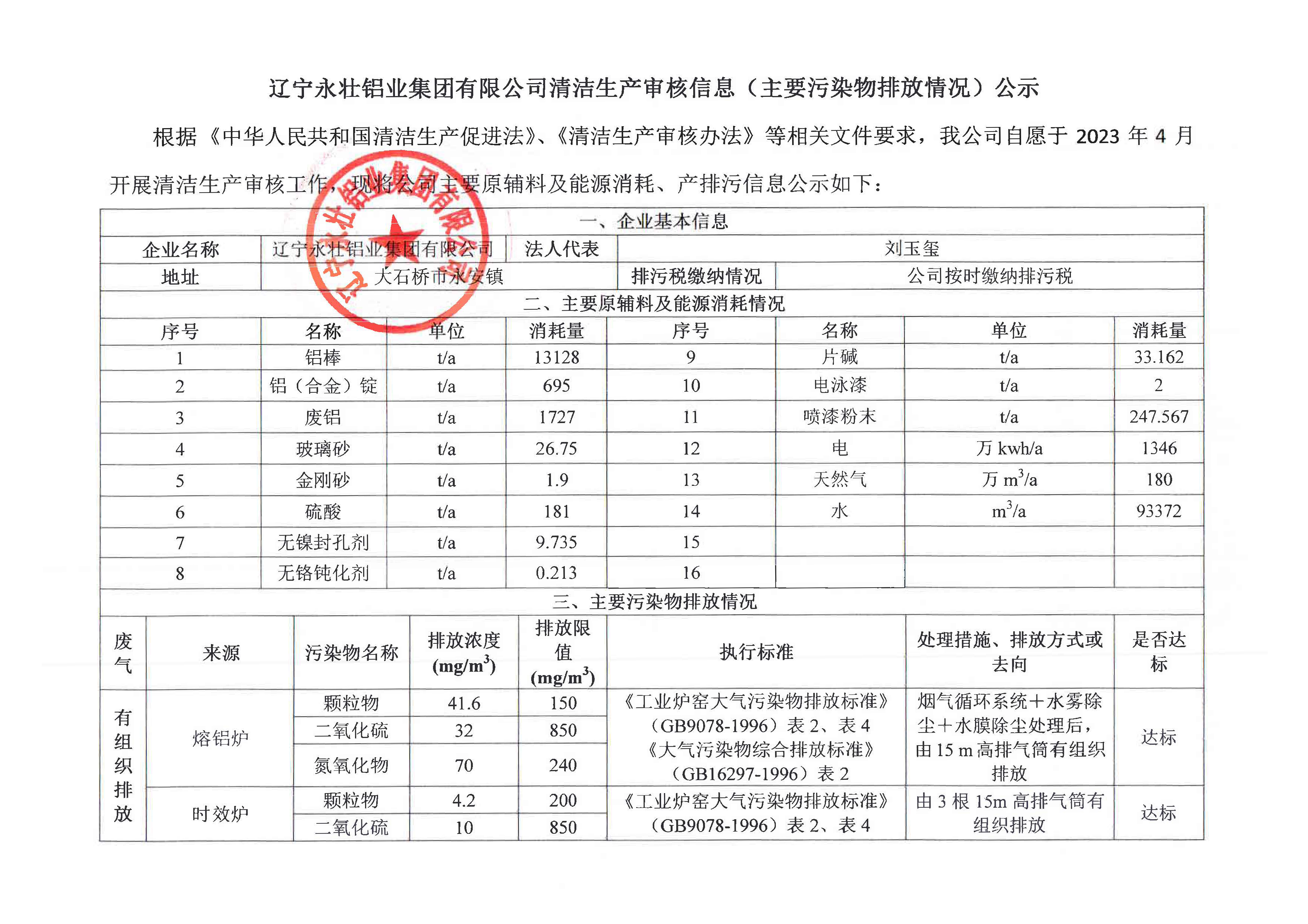 遼寧永壯鋁業集團清潔生產審核信息(主要排污物排放情況)公示